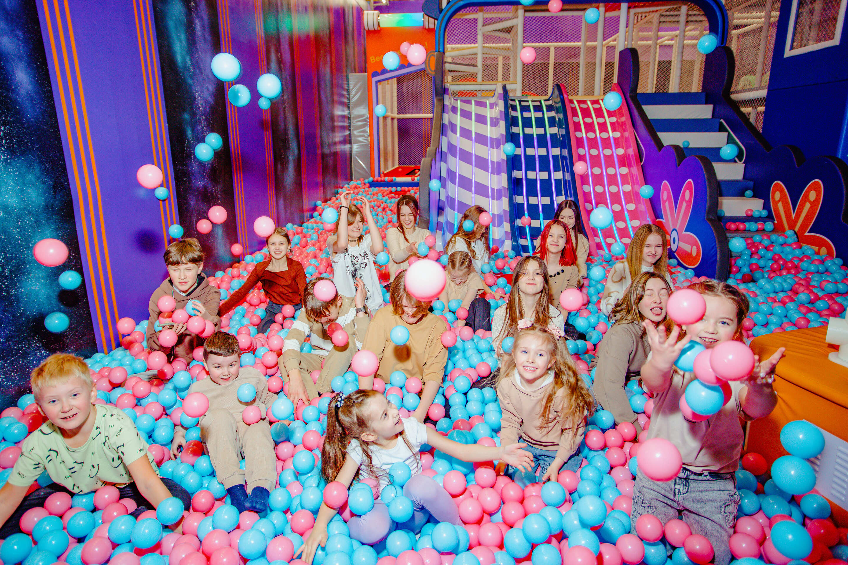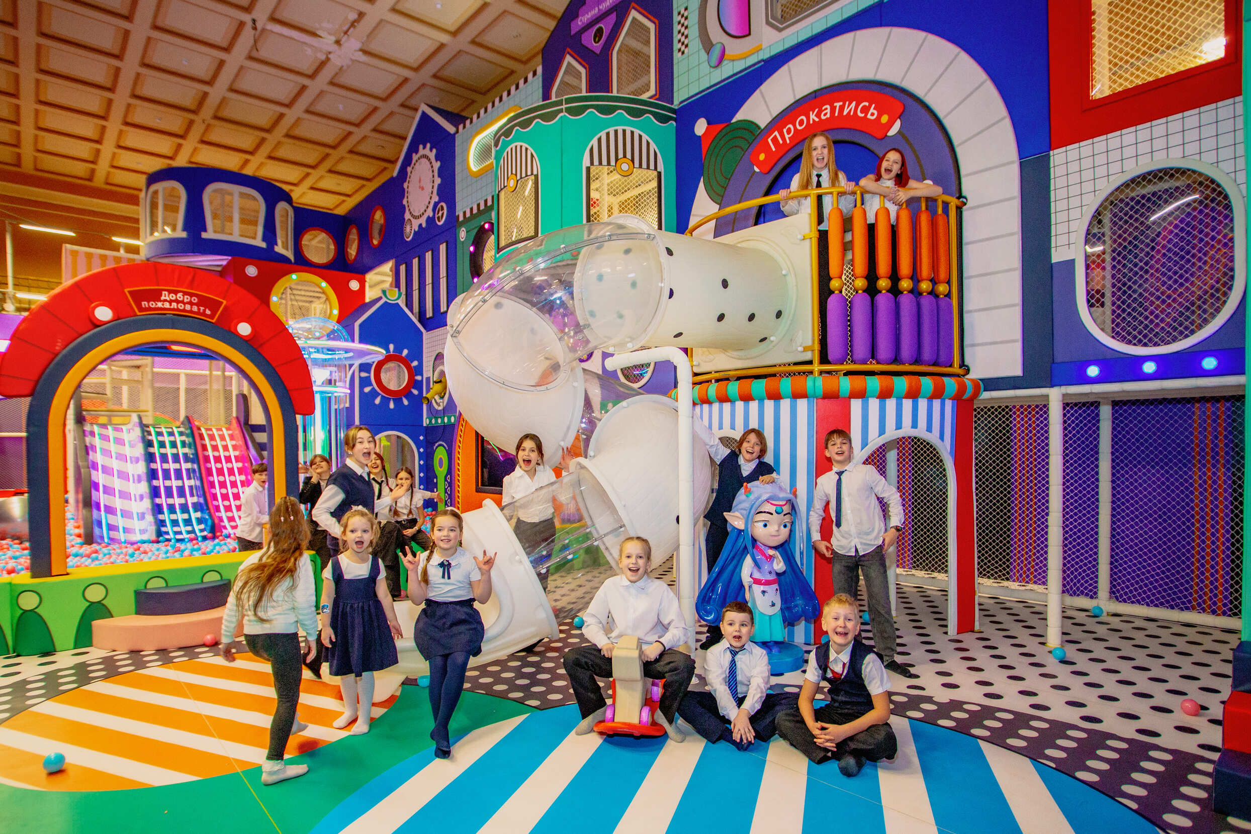 Целый город для исследований! Забирайся на высоту до 7 метров, пролезай через тоннели, скатывайся с горок прямо в бассейн с шариками. Здесь весело!