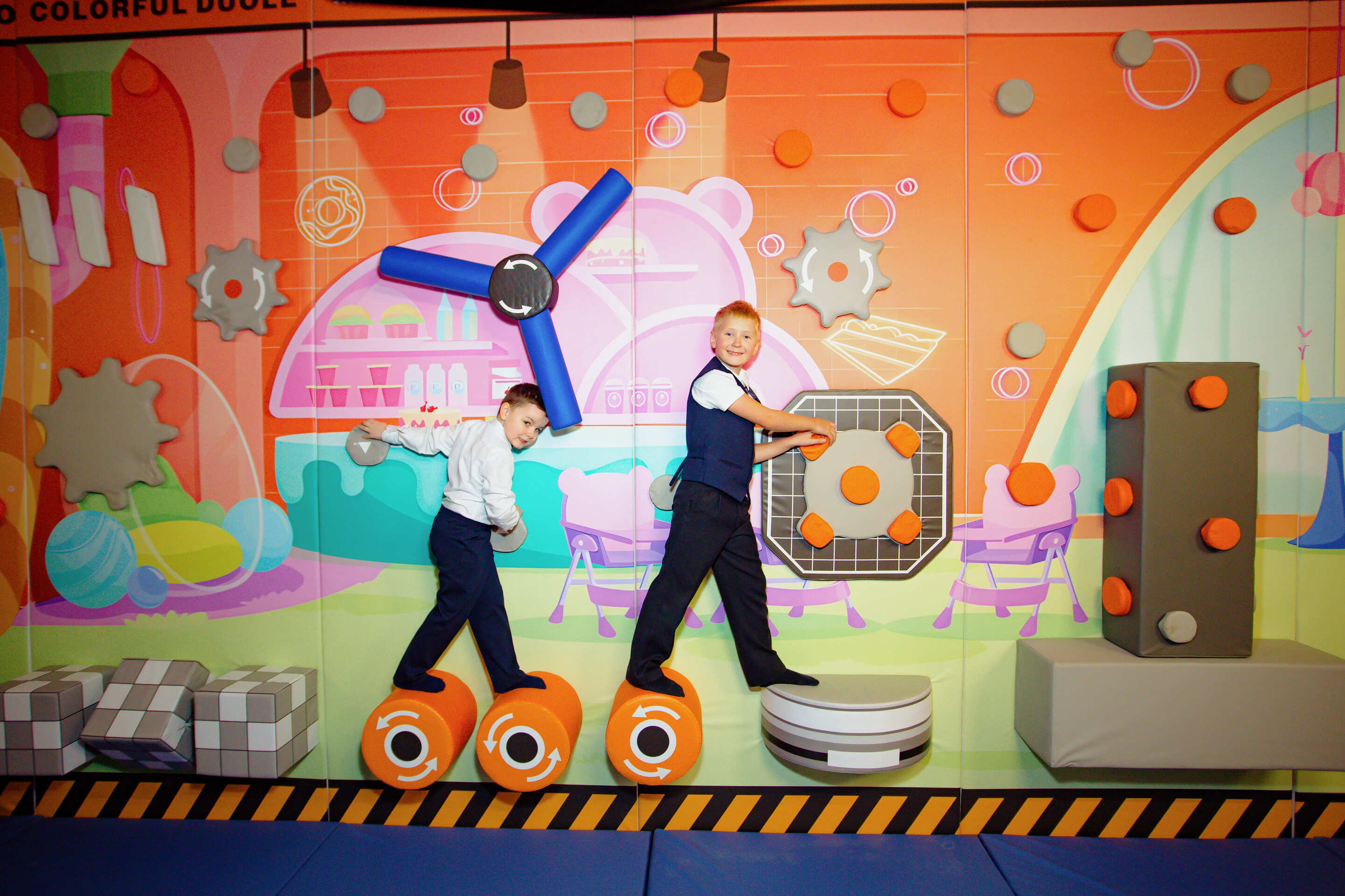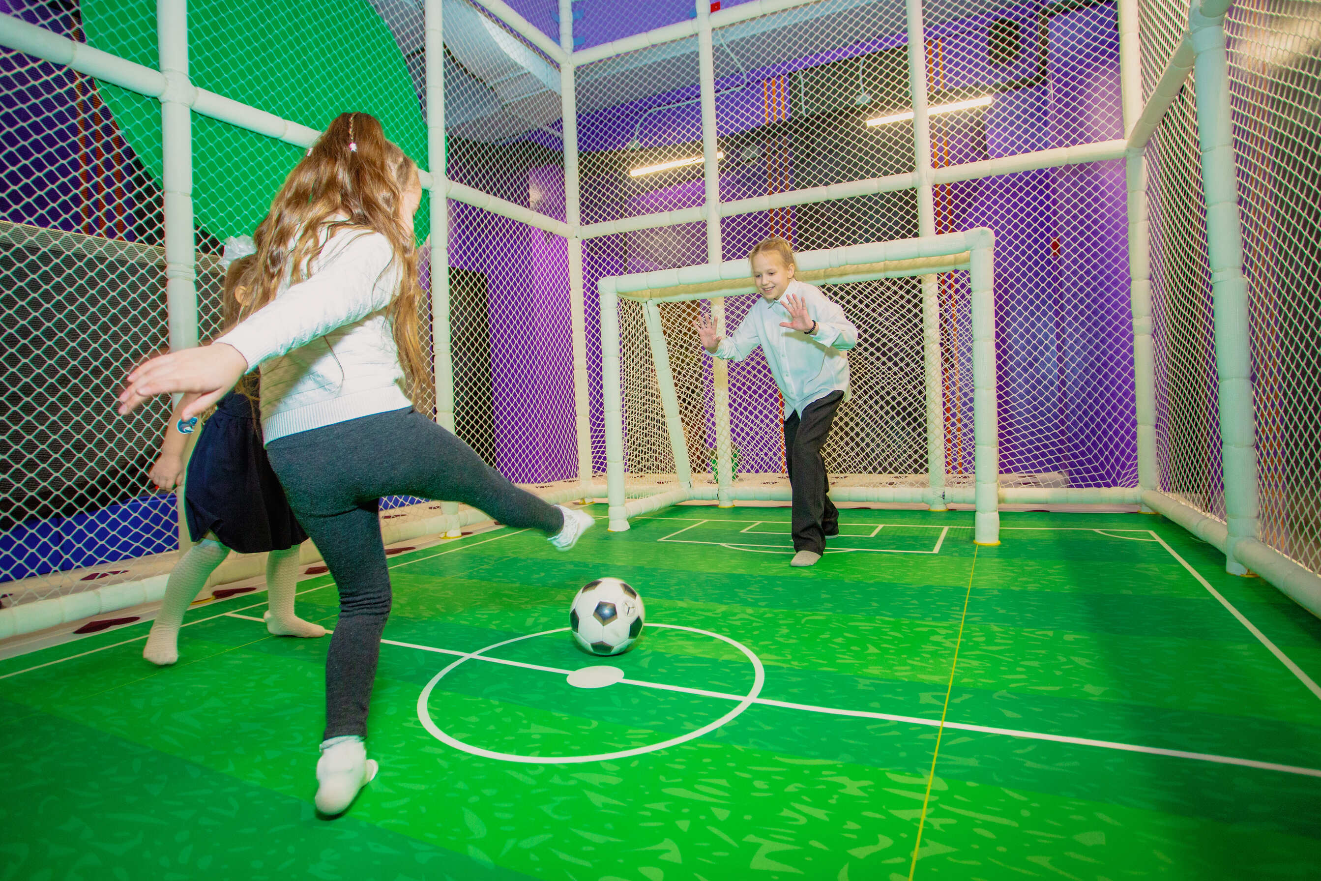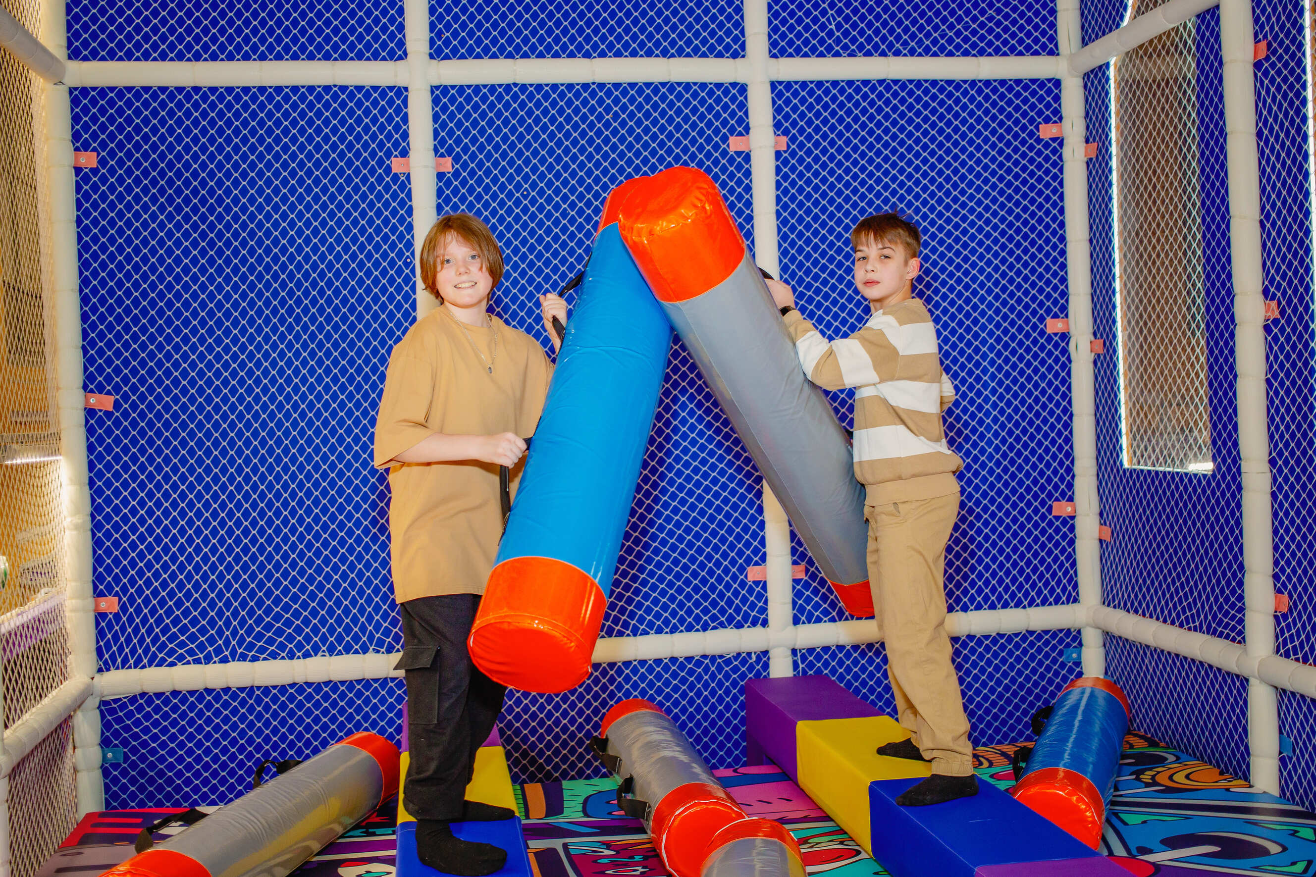 Все конструкции изготовлены из безопасных материалов, а зоны оборудованы мягким покрытием. Вход без обуви, в носочках.